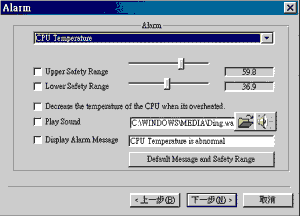 下拉列表中提供了对CPU,主板,等等的报警对象,您可设置无限多的报警选项,但比较实用的是CPU,主板等的温度报警设置。直接选择就行了。