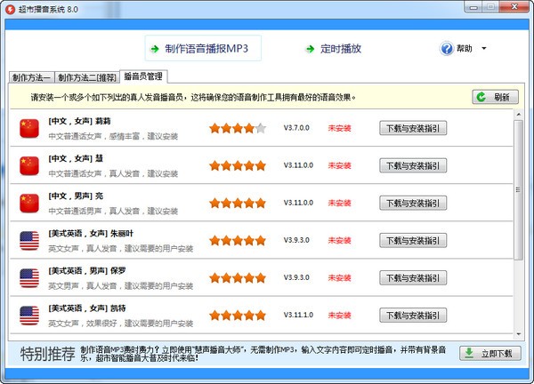 超市播音系统是一款适用于适合于所有超市使用的播音软件,代替了播音员直接进行广播,拥有不同国家语言的文稿,可以将不同国家的文字文稿转录成音频文件,还可以定时广播,播报时,可以选择顺序播放,也可以定时顺序播放、定时乱序播放等。