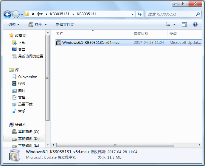 2.下载完毕,双击Windows6.1-KB3035131-x64.msu安装。
