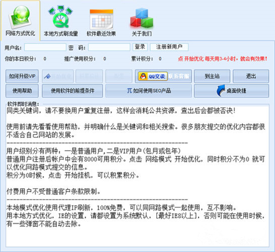 一、本地优化通过代理服务器方式模拟不同机器环境来刷网站流量和排名,有很多优点不同于其他同类软件: