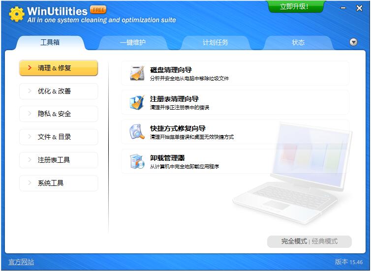 WinUtilities是一套Windows优化工具,WinUtilities提供的功能包括:磁盘清理 、注册表清理/备份、自启动程序管理、内存优化、查找重复文件、快捷方式修复、进程管理、卸载管理、系统信息、文件分割/合并、文件清除、可执行文件加密、家长监视控制以及调用Windows系统自带小工具等诸多功能。