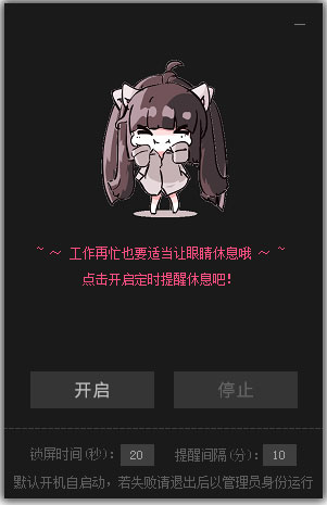 护眼提醒是一款非常可爱的桌面护眼提醒软件,用户打开后对软件进行设置,软件每隔一阵子就会弹出一个非常可爱的动漫头像提醒用户该进行休息了,护眼提醒还设置了自动锁屏功能,由用户决定每次休息多久,软件会自动锁屏让用户休息一阵子。