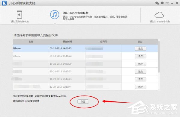 2、点击下方的【浏览】按钮,浏览您所保存的备份文件的路径,选择指定的备份文件(需要注意的是,备份文件需要保存在电脑本地才能被系统进行读取);