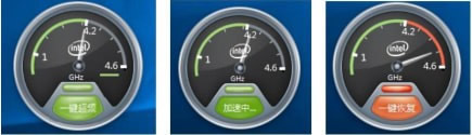 点击一键超频按钮,执行 CPU 超频操作,超频成功后,灰色部分会变成橙色,表示 CPU能到达新增的频率范围。如下面图中所示,CPU 一键超频后频率指针可以从 4.2G Hz 摆动到4.5G Hz。点击一键恢复按钮,CPU 会恢复到超频前状态。