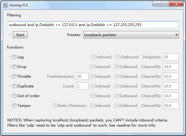 当你输入了 filter 点击 ‘开始’ 后,clumsy 就已经开始截获包裹。这个一定会有一定的效率损失。但好消息是 clumsy 本身就是为了模拟网络状况糟糕的软件所以这个问题不是很严重。 另一方面,你应该精确的设置 filter 的内容,让它尽可能准确的捕捉你感兴趣的数据包。
