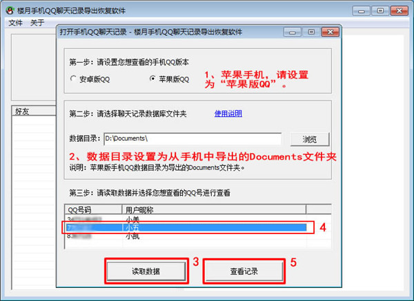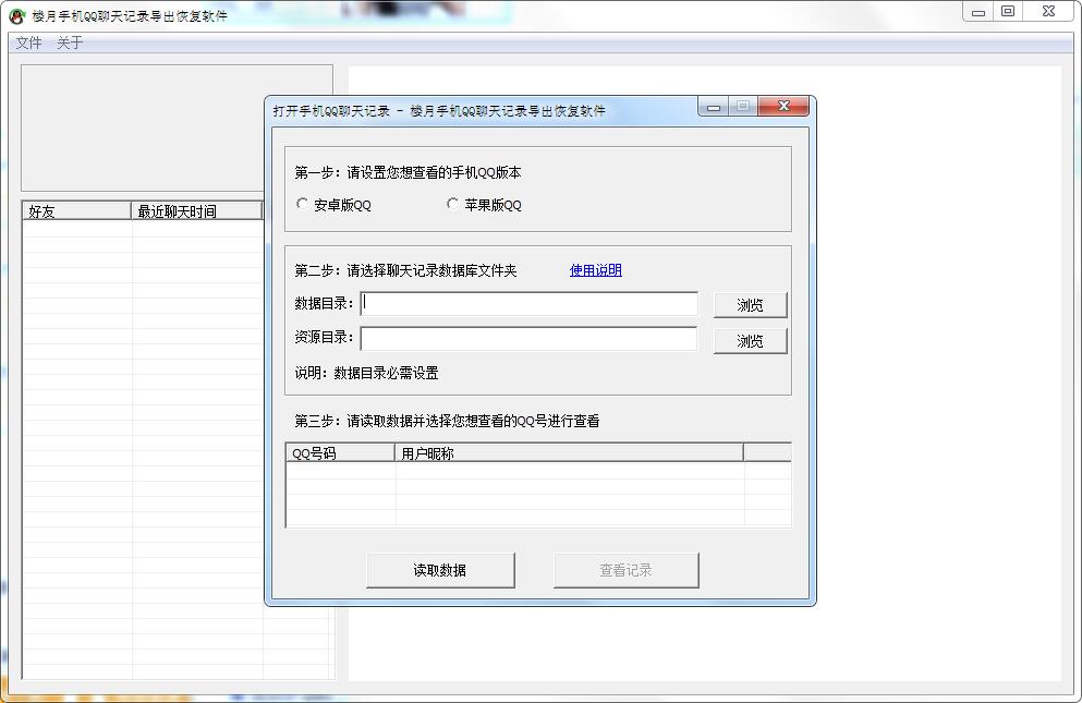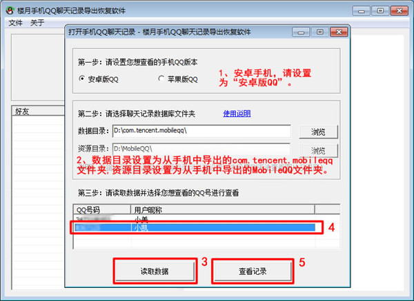 2,打开“楼月手机QQ聊天记录导出恢复软件”,根据自己手机型号设置好QQ版本,然后设置好数据目录(及资源目录),接着点击“读取数据”按钮,然后软件会将目标文件夹中曾经登陆过的QQ号码读取出来,选择一个想查看及恢复QQ聊天记录的QQ号后点击查看按钮即可。