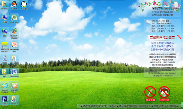 企鹅桌面是一款桌面美化软件,极速、小巧(主程序仅几十K)、稳定、占用资源超低、绿色便携、永久免费;超强的壁纸随机特性,让您的桌面可以更加绚丽多彩。功能:随机或固定模式更换壁纸、IE主页锁定、天气预报、网吧公告、网吧机号显示、部署修改分辩率、标语提示、节日智能插图、图标排列、图标同步等一系列网吧最为实用的强大功能!!!