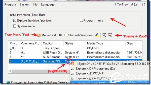 启动该程序。第一次为您提供安全删除USB,SD,。。.驱动器的默认设置。例如,通过任务栏的“信息”区域直接打开驱动器(Explorer)以打开,关闭和弹出驱动器。但你可以快速定制一切!