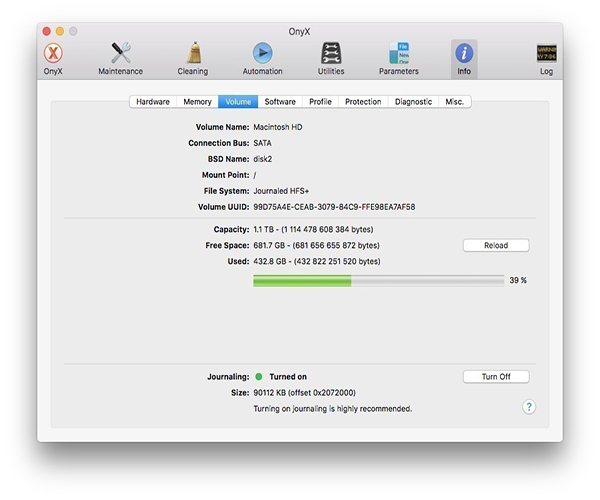 OnyX 可以帮助你检视启动的磁盘信息和文件系统的结构信息,而且可以运行很多的系统维护子程序,比如配置Finder,Dock, Dashboard, Exposé, Safari, Login window中的一些隐藏的功能。