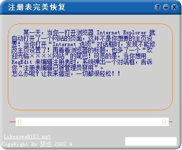 注册表完美恢复是一款注册表恢复工具,主要功能是去掉一些网站对注册表的修改功能有点与金山毒霸的注册表恢复相似,不过自动去掉网页对注册表的功能比金山的还多一点。
