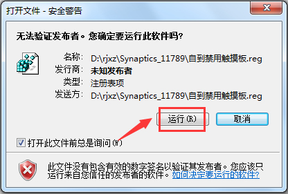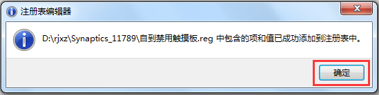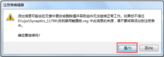 4、下面就要用到自动禁用触摸板注册表了,在压缩包内点击“自动禁用触摸板.reg”注册表文件,弹出的对话框直接点“是”
