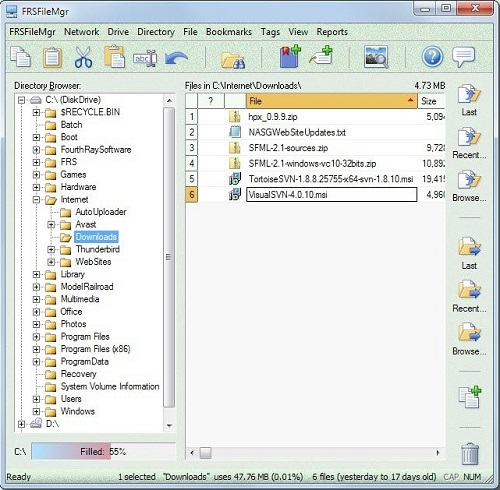 FRSFileMgr在主窗口中显示两个窗格。左侧是目录浏览器,右侧是主文件网格。目录浏览器仅显示驱动器号和目录,而“文件”网格仅显示文件(Windows资源管理器还显示包含文件列表的子目录,这令人困惑)。在FRSFileMgr中,当您在目录浏览器中选择左侧的内容并且所选驱动器或目录本身包含任何文件时,它们将显示在右侧的“文件”网格中。如果没有文件,右侧的列表将为空。
