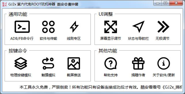 搞机工具箱是一款利用ADB来操作手机的程序,用户可以在不需要Root的情况下实现一些羊机自设盖中不真有的功能,无需ROOT!可去除x,隐藏导航,模拟手势,调整界面,冻结应用等,还有PC实用的功能!