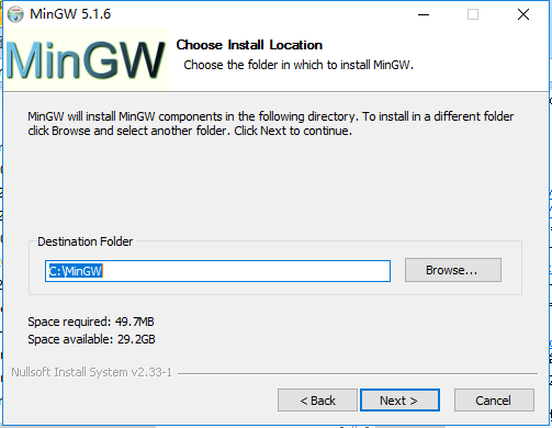 6、选择MinGW安装位置,您可以点击【next】,软件会自动安装。或者您可以点击【Browse】,在弹出的安装位置界面中,您可以自行选择MinGW安装位置,选择完成后,点击【next】。