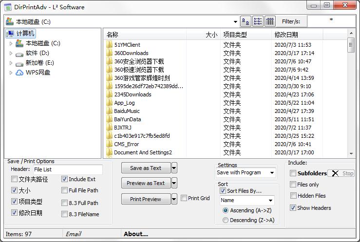 DirPrintAdv是一款简单实用的打印文件夹列表软件,如果你有很多的文件资料在一个文件夹中,这将是你整理文件的好帮手,软件支持输出为 txt 、html 、csv 等文件,当然你也可以直接打印出来,建议你输出之前设置一下排序和字体,方便查看。