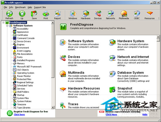 FreshDiagnose这个免费的工具软体能够替你分析电脑的效能,如CPU、硬盘、影像、CD/DVD、主板等等,并将测试结果与其他的电脑比较;还可以帮你收集电脑系统中的各项资料,如主板、显示卡、PCI/AGP插槽、一般周边(键盘、鼠标、打印机)、网路等等。有了这些资料,你就可以知道到底电脑效能的「瓶颈」在哪里,加以改进的话,说不定你的电脑可以执行得更加快速喔!