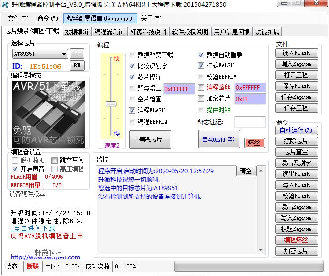 1、程序开启,启动时间为:2018-10-30 8:54:42轩微科技祝您一切顺利。您选中的目标芯片为:AT89S51,没有检测到所支持的设备连接到计算机。