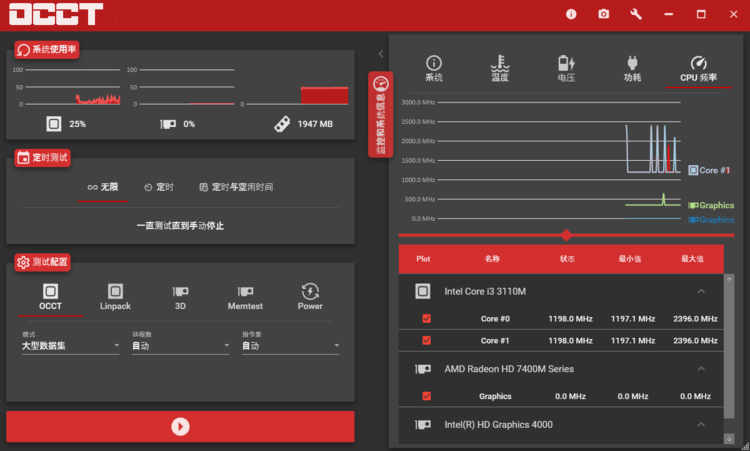 10、支持OCCT自己定制的测试。测试强度比 Linpack小,但更好地发现稳定性问题!