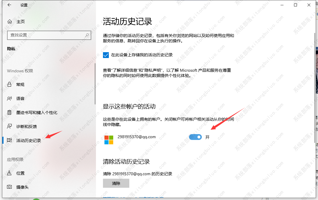 3、然后在下方点击”开启活动历史记录“功能即可。