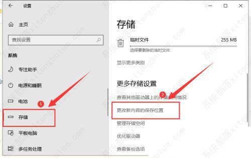 3、选择左侧“存储”,在右侧点击“更改新内容的保存位置”。