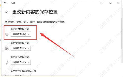 4、然后将“新的应用将保存到”修改为“D盘”或其他盘中,这样就更改了应用商店的下载路径。