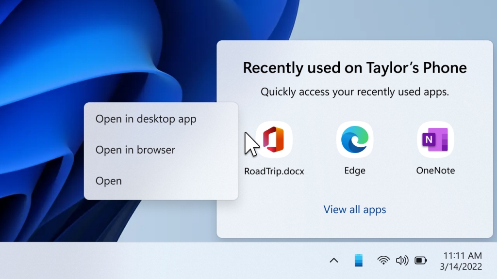 您可以使用 Office 移动应用程序随时随地访问您的 Office 文档,但现在通过您的手机与 Office 的更深入集成,当您回到您的 PC 时,您可以在 Office 桌面应用程序或浏览器中打开支持的文档并选择在您离开手机的地方。只需从任务栏系统托盘中的“您的手机”图标或“您的手机”应用程序的“应用程序”页面中的“最近的应用程序”弹出菜单中单击文档图标,然后继续工作而不会错过任何一个节拍。