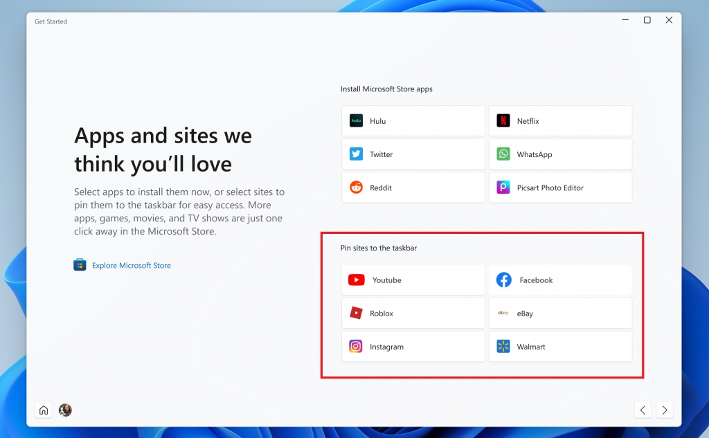 我们在“入门”应用中添加了固定站点建议,以便您可以方便地将网站固定到任务栏。要查找此新功能,请启动“入门”应用并导航至“我们认为您会喜欢的应用和网站”页面。单击页面上建议的任何站点,将其固定到您的任务栏,这样您就可以一键访问您关心的站点。请在应用程序 > 开始下的反馈中心 (WIN + F) 中提交反馈。