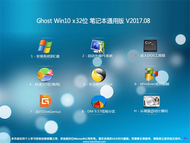 大地系统Win10x32位笔记本通用版系统仅用于进行演示基于万能GHOST的快速部署技术,除了系统和光盘中明确标识为原创 作品的软件外,其他的全部文件归属于原版权人所有。我们不承担任何技术和版权问题,没有提供任何技术支持的义务.请勿将本系统用于商业用途!